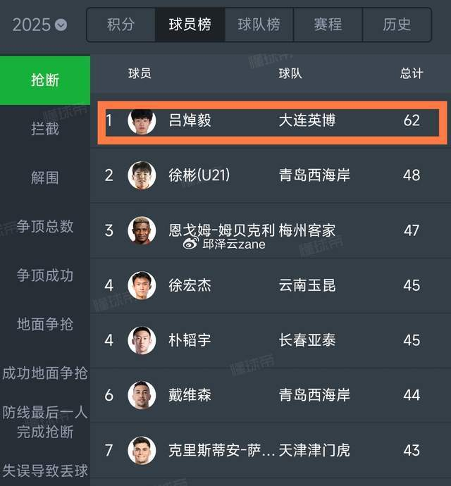 第一个,他最近中超4场比赛完成了15次抢断,其中有3场都是全场抢断最多的球员。本赛季他已经完成了64次抢断,在本赛季的中超抢断榜上断崖式领先,比第2名多出了14次,超出了所有内外援,足以看出他的抢断能力。