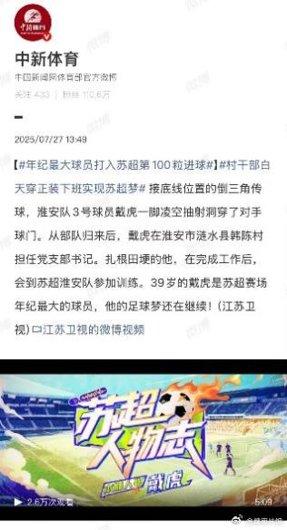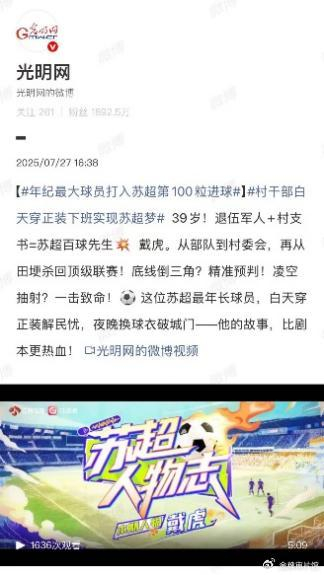 7月26日,《江苏超会玩》衍生节目《苏超人物志》上线。首期便将镜头对准这位足球场上的村支书,讲述了他的“双面人生”。短片一经发布,得到光明日报、人民网、光明网、中新体育等主流媒体的转发,点赞他“用热血诠释足球最美的样子”。#村干部白天穿正装下班实现苏超梦#也迅速登上微博热搜。