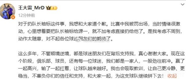 先是国门王大雷在社交媒体公开向球迷道歉。原因就是在第19轮联赛中,王大雷被红牌罚下,当场扔队长袖标,引发了球迷的激烈批评。如今,他也在社交平台发声表示道歉,并承认自己动作太随意,对不起球迷的期待,表示要更冷静,不辜负球迷的信任和支持。