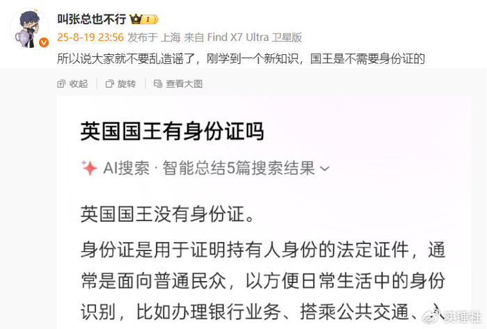 不过他本人近日也在粉丝群里进行回应,坦言自己并不在乎这件事,大家该吃吃该喝喝,过好每一天才最重要。但让人意外的是,IG的老板没有放过他,直接发微博内涵,“英国国王是不需要身份证的”。Elk的外号是小人国国王,所以张总就是在暗讽Elk不当人,也算是开了一手好团。