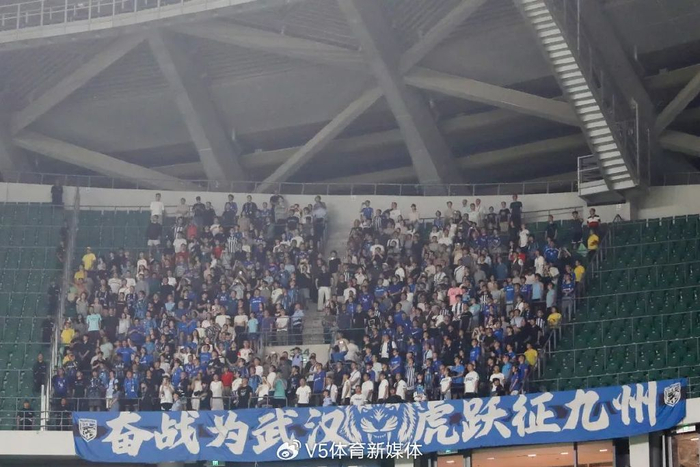 而在工体西看台顶端的角落,“奋战为武汉 虎跃征九州”的蓝色横幅在绿浪中格外醒目。几百余名武汉远征军的呐喊声始终未歇——即便球队已七轮不胜,他们依旧选择跨越千里追随,只为守护心中那抹蓝。