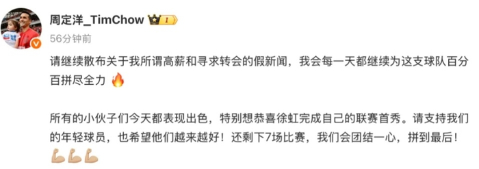中超联赛第23轮,成都蓉城主场4-1大胜上海海港,在多赛1场的情况下,以50个积分暂时登上了积分榜榜首。赛后成都蓉城队长周定洋在社媒发文,感谢了队友们的付出,同时驳斥了自己要求高薪和谋求转会的流言蜚语。