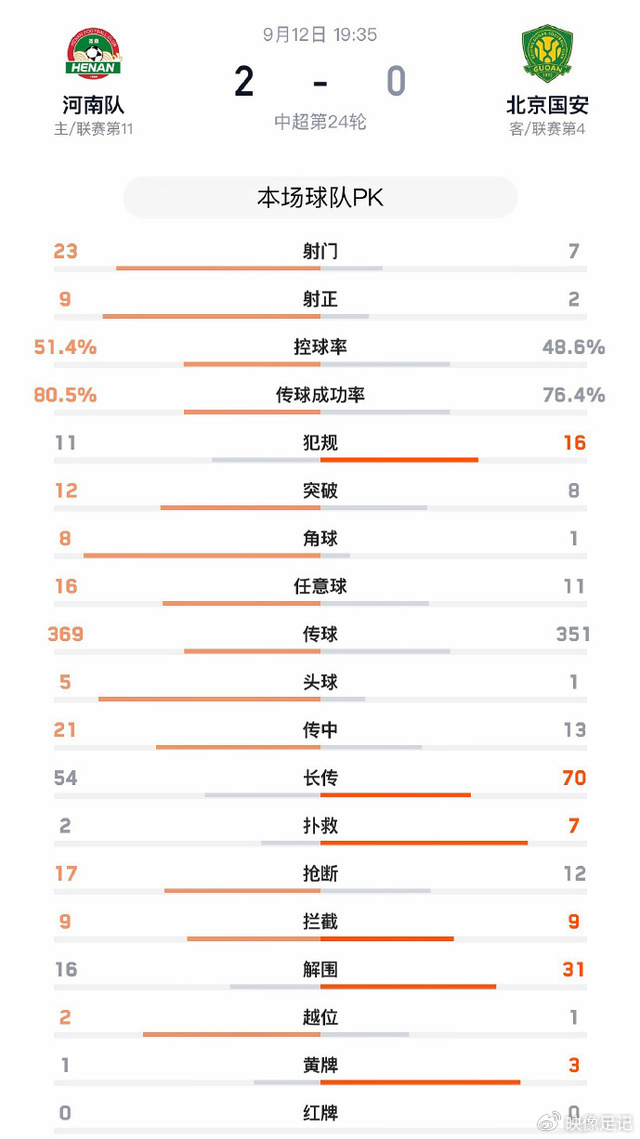 下半场比赛,河南队大胆的伺机高压,让后场无法从容的组织起有效进攻,只能仓促出球以及开大脚,河南队将阵线牢牢压制在对手半场,连续打出前场的快速转换,并且多次形成射门。这也是本场比赛双方在控球率基本上五五开持平的情况下,射门比23-7,射正比9-2的原因。