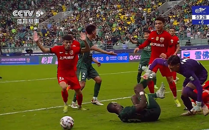 直到上半场补时阶段,北京国安在一次角球进攻中,法比奥门前准备打门时突然倒地,主裁判第一时间没有表示,随后通过VAR确认之后改判点球,同时向王燊超出示一张黄牌警告。随后,法比奥主罚点球打进,帮助北京国安压哨1-1扳平比分。