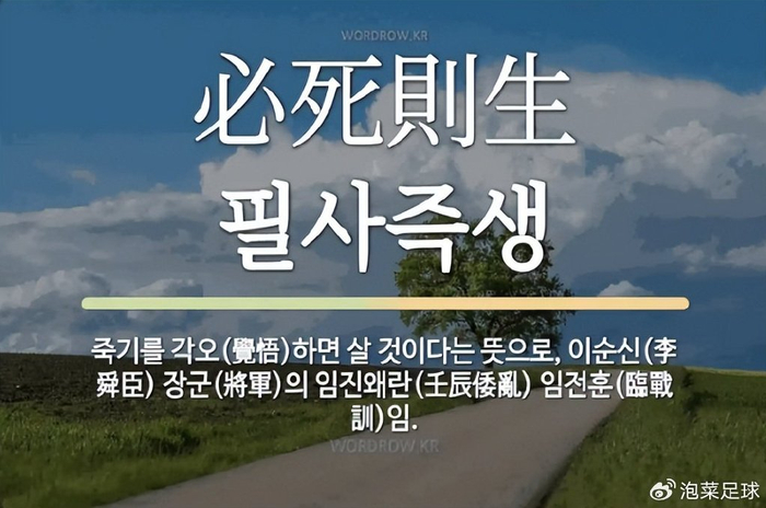 “必死则生”一词出自战国兵书《尉缭子》中的《兵教下》篇章,强调将士临战时应具备决死信念的军事理念。该思想认为,抱有必死决心方能激发斗志、获得生机,若贪生侥幸则必败无疑。该词汇在朝鲜时代,被抗倭名将李舜臣当做“座右铭”使用,最终激励战士们击败了穷凶极恶的倭寇,取得了鸣梁海战的胜利。现不仅作为韩国体育界“打翻身仗”的激励口号,更成为韩国***体育部队(尚武)的球队口号。因此对于韩国U20代表队来说,“必死即生”这四个字是沉甸甸的,他们必须要拿出这样的精神,才有可能创造奇迹!